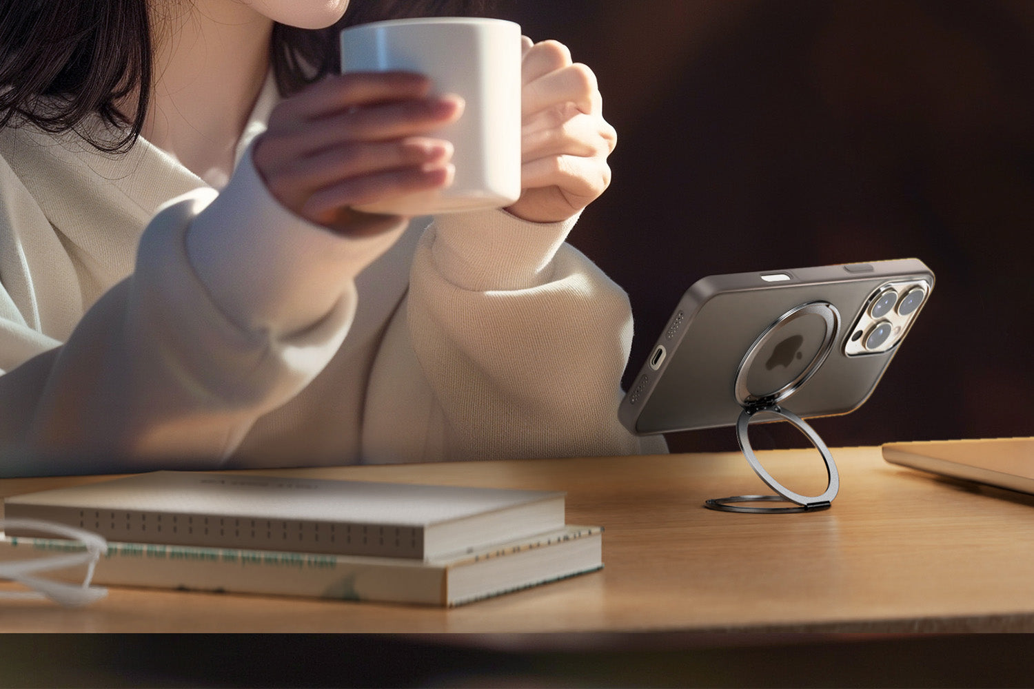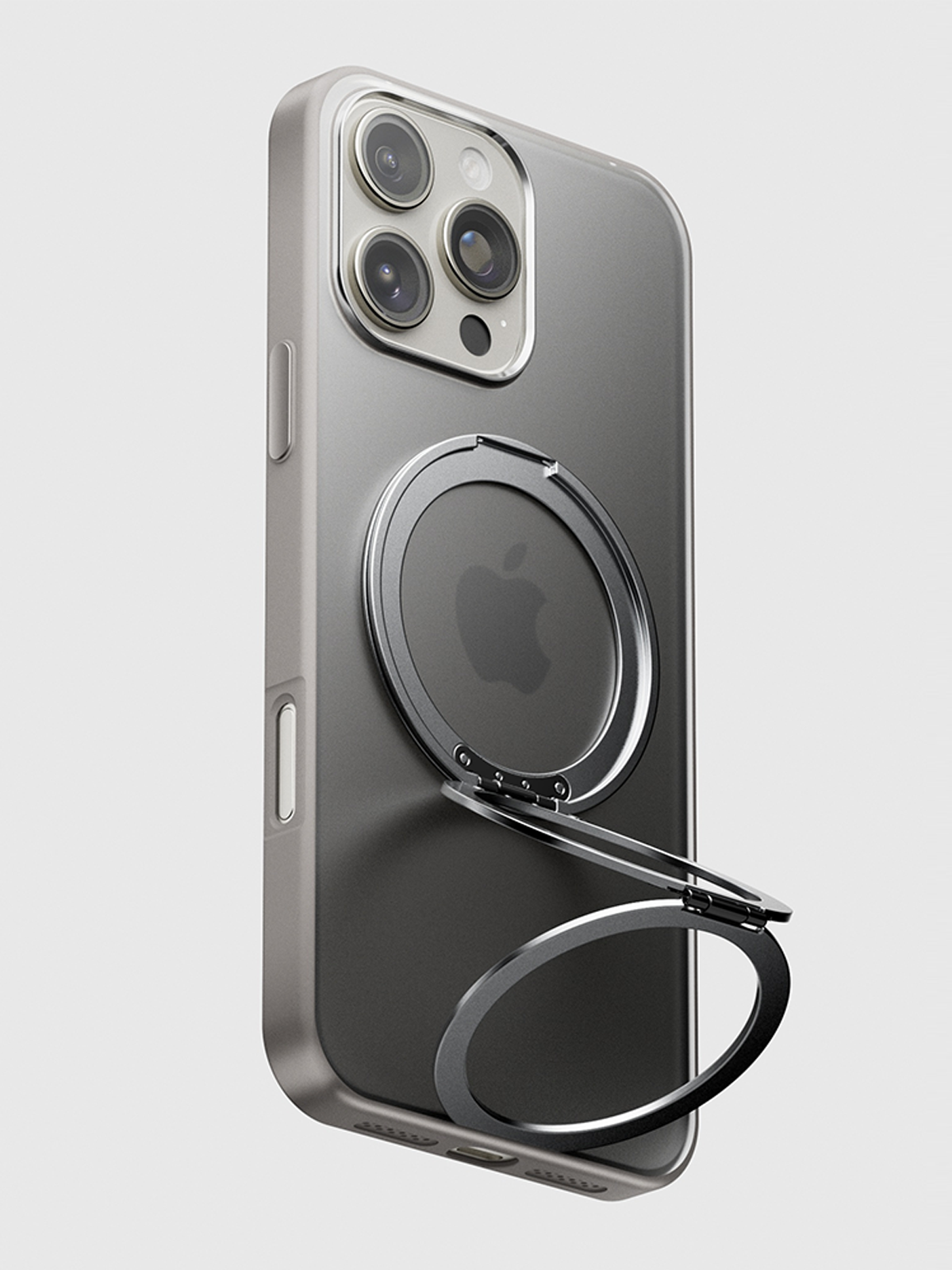 The two-ring holder is so slim and discreet when folded that it blends seamlessly into the design, ensuring your phone lies flat without bulging on surfaces, and slides effortlessly into your pocket, preserving the phone's minimal, sleek profile.