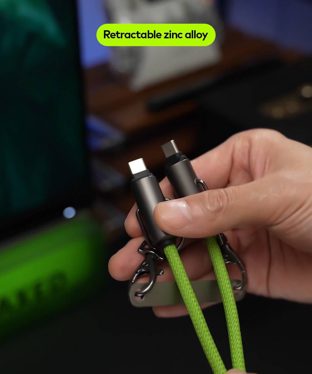 Retractable zinc alloy covers are designed on both ends of the lanyard to protect the charging ports which can be easily revealed with a simple slide.